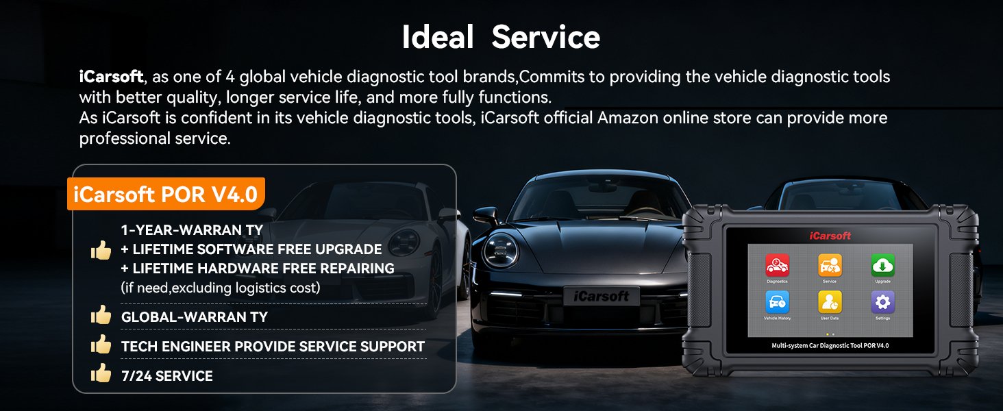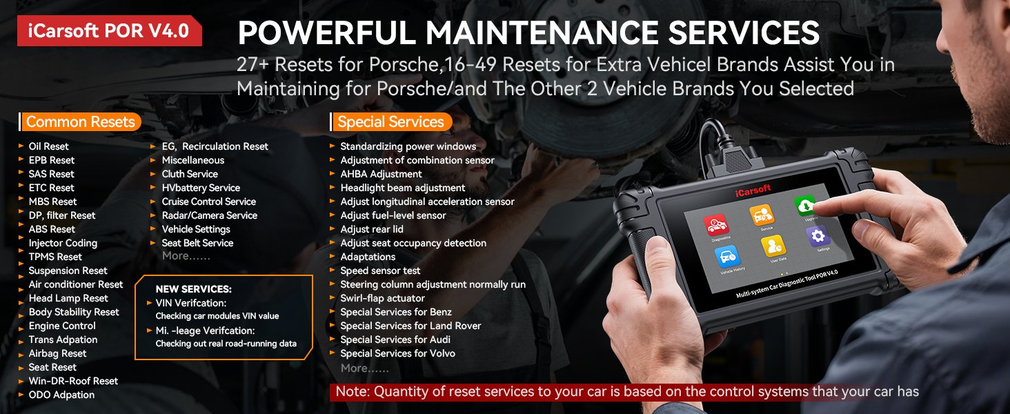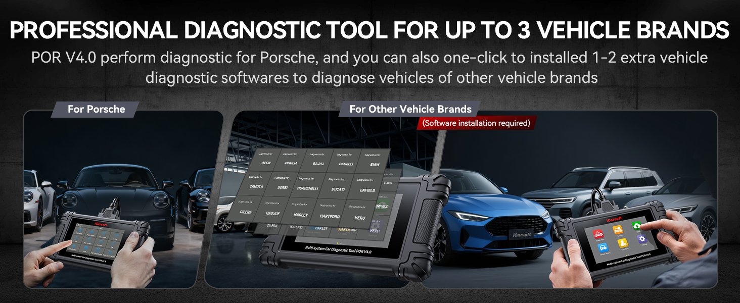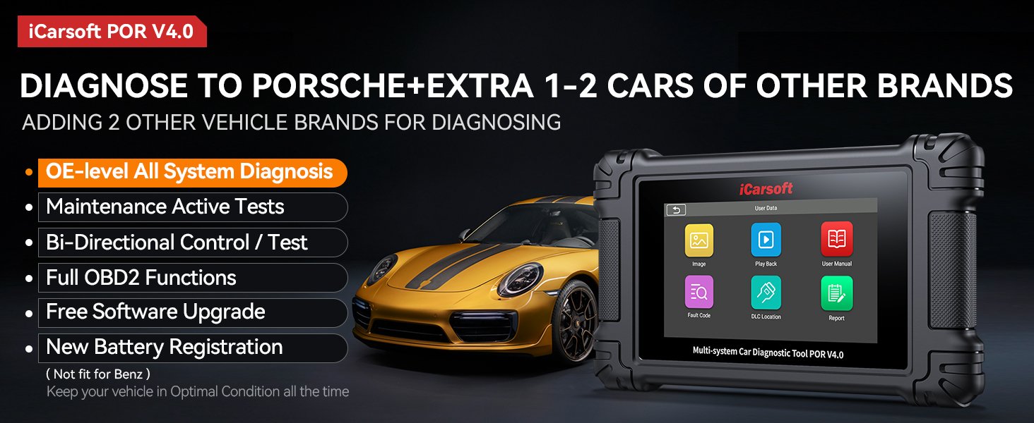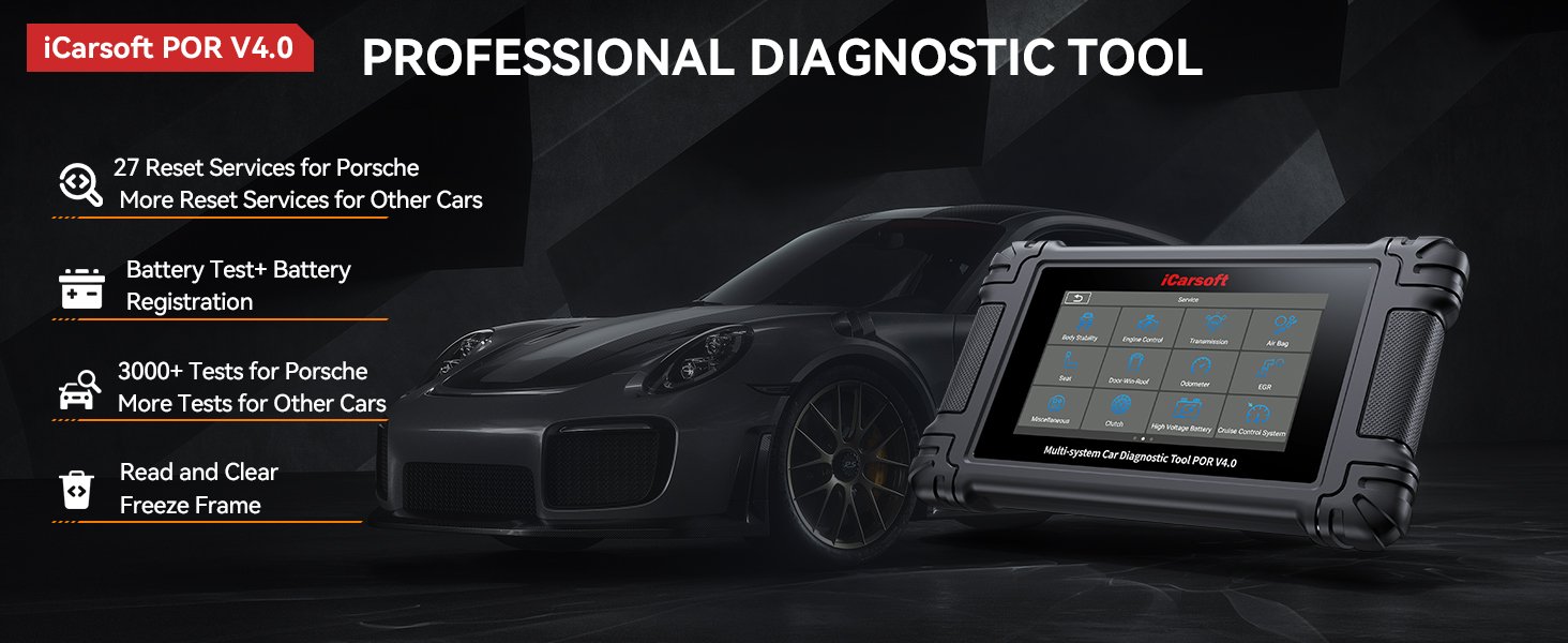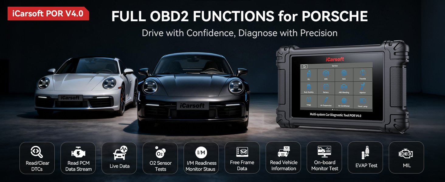 The iCarsoft POR V4.0 is a professional diagnostic scanner designed specifically for Porsche vehicles, offering full-system diagnostics beyond basic OBDII functions. It comes pre-installed with Porsche software and allows you to read and clear fault codes, access live data, perform bi-directional tests, and execute over 20 service and reset functions such as oil reset, DPF regeneration, battery management and TPMS reset. The device also features automatic VIN identification, lifetime free online updates, and a user-friendly 5″ touchscreen with Wi-Fi connectivity, making it ideal for both DIYers and workshop professionals working on Porsche models.