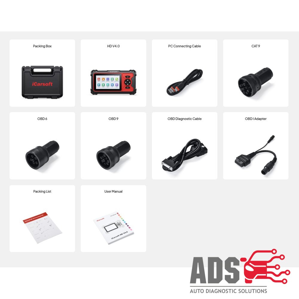 The iCarsoft HD V4.0 is an advanced diagnostic solution designed for heavy-duty trucks and commercial vehicles. Featuring a 5-inch touchscreen and lifetime Wi-Fi updates, it enables comprehensive system diagnostics including engine, ABS, SRS, transmission, and more. The device supports reading and clearing fault codes, viewing live data, and performing essential service and maintenance functions. With broad vehicle coverage and multiple diagnostic adapters included, it is a reliable and user-friendly tool for professional workshops and technicians.